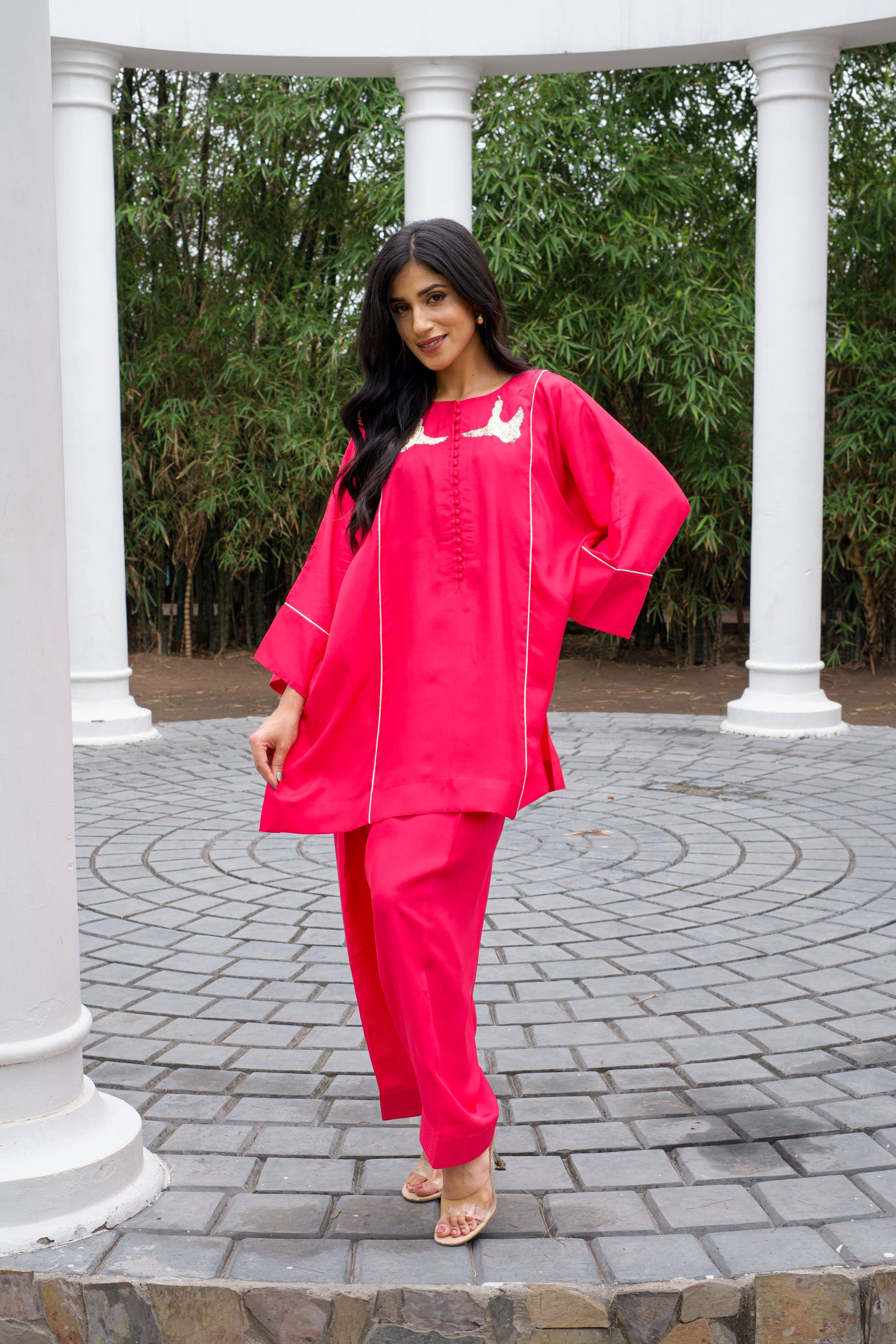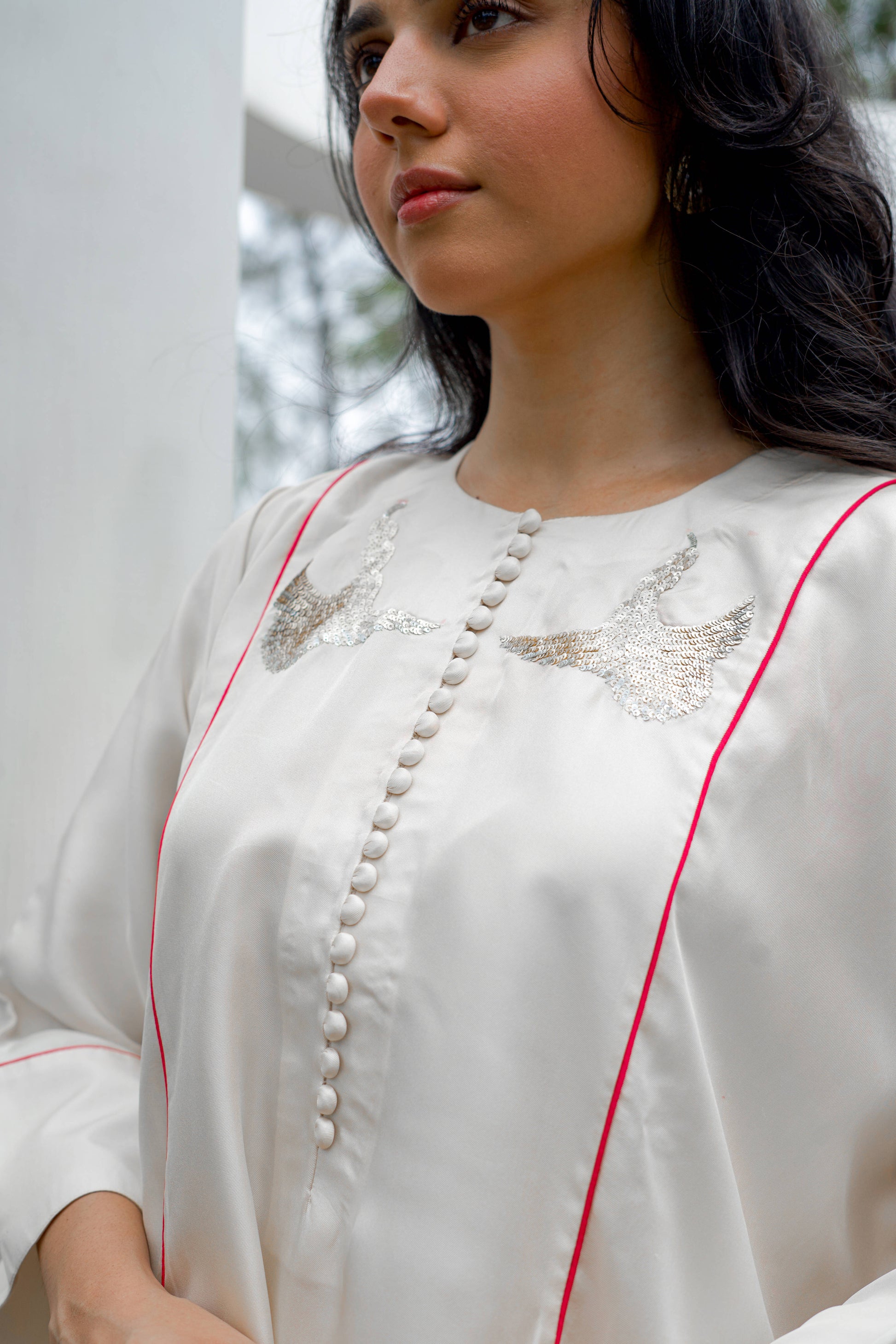 A relaxed silk set with an easy silhouette and soft structure. Finished with delicate handwork and subtle contrast piping, it feels effortless, comfortable, and quietly elegant.