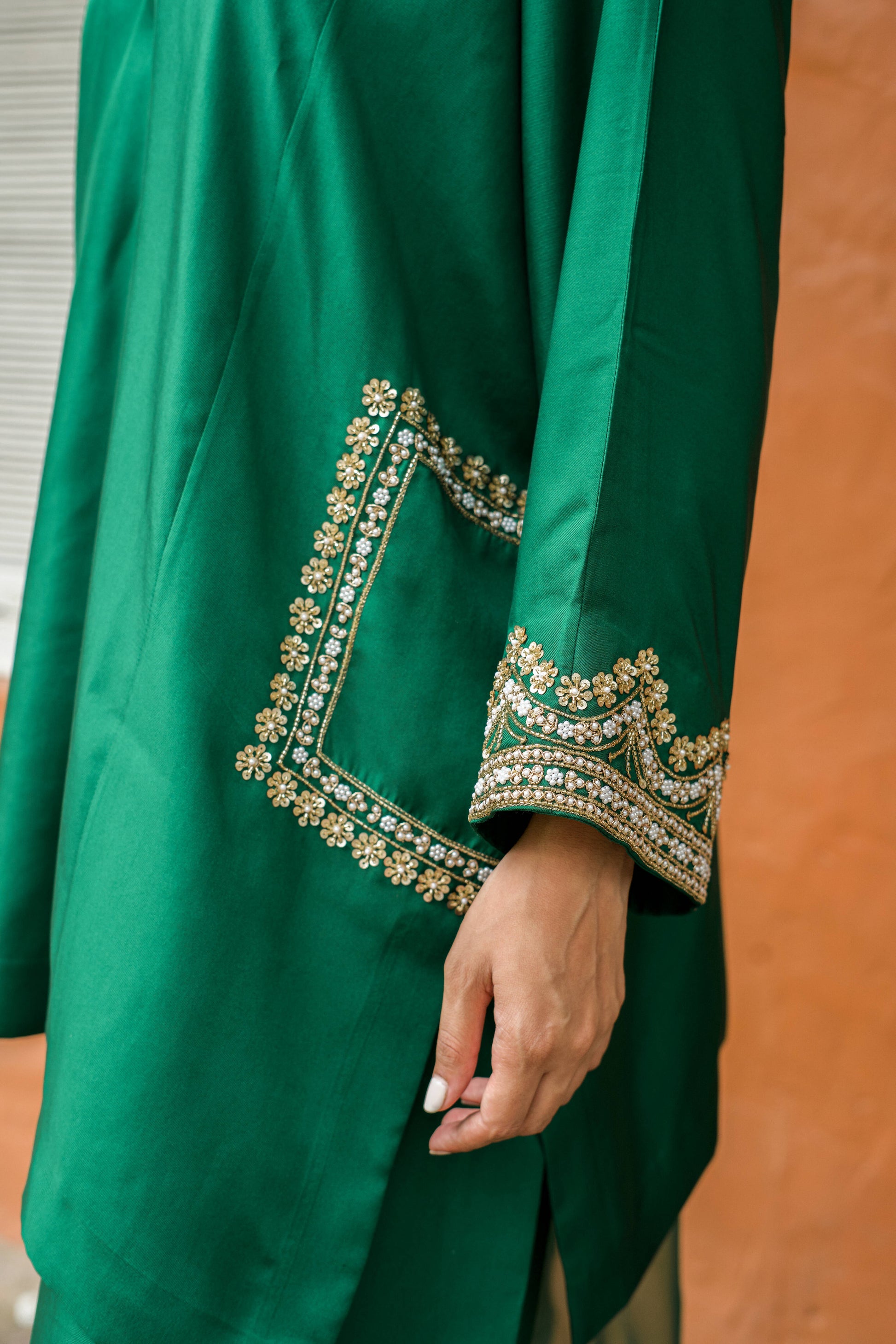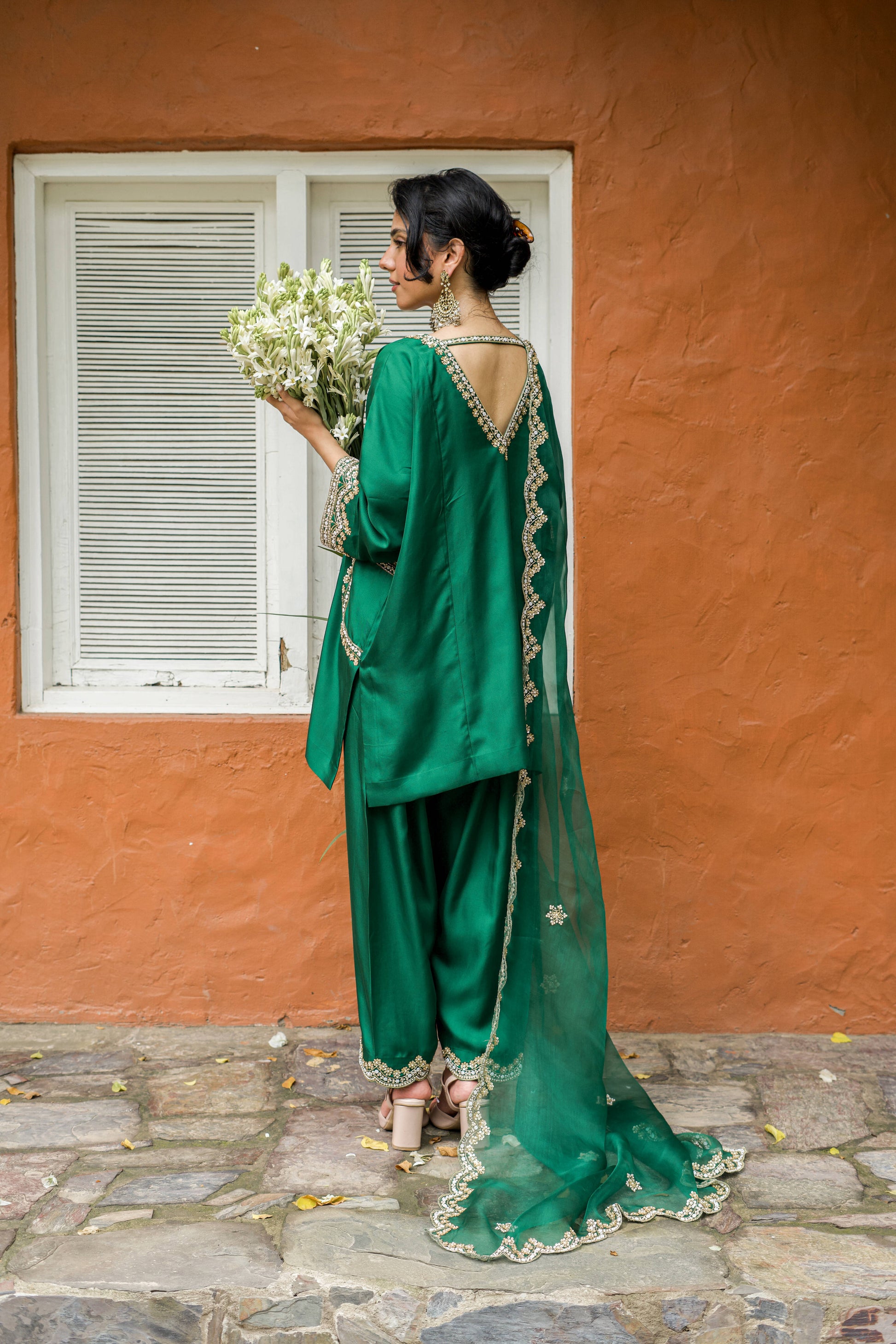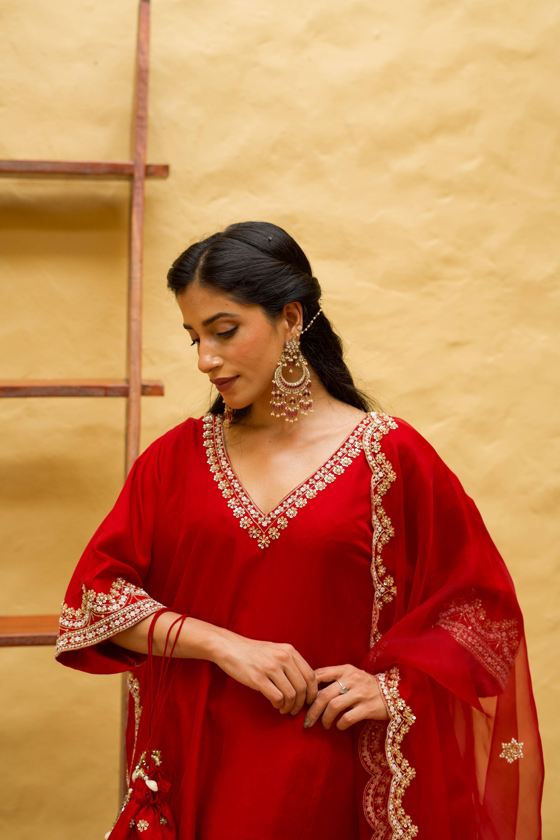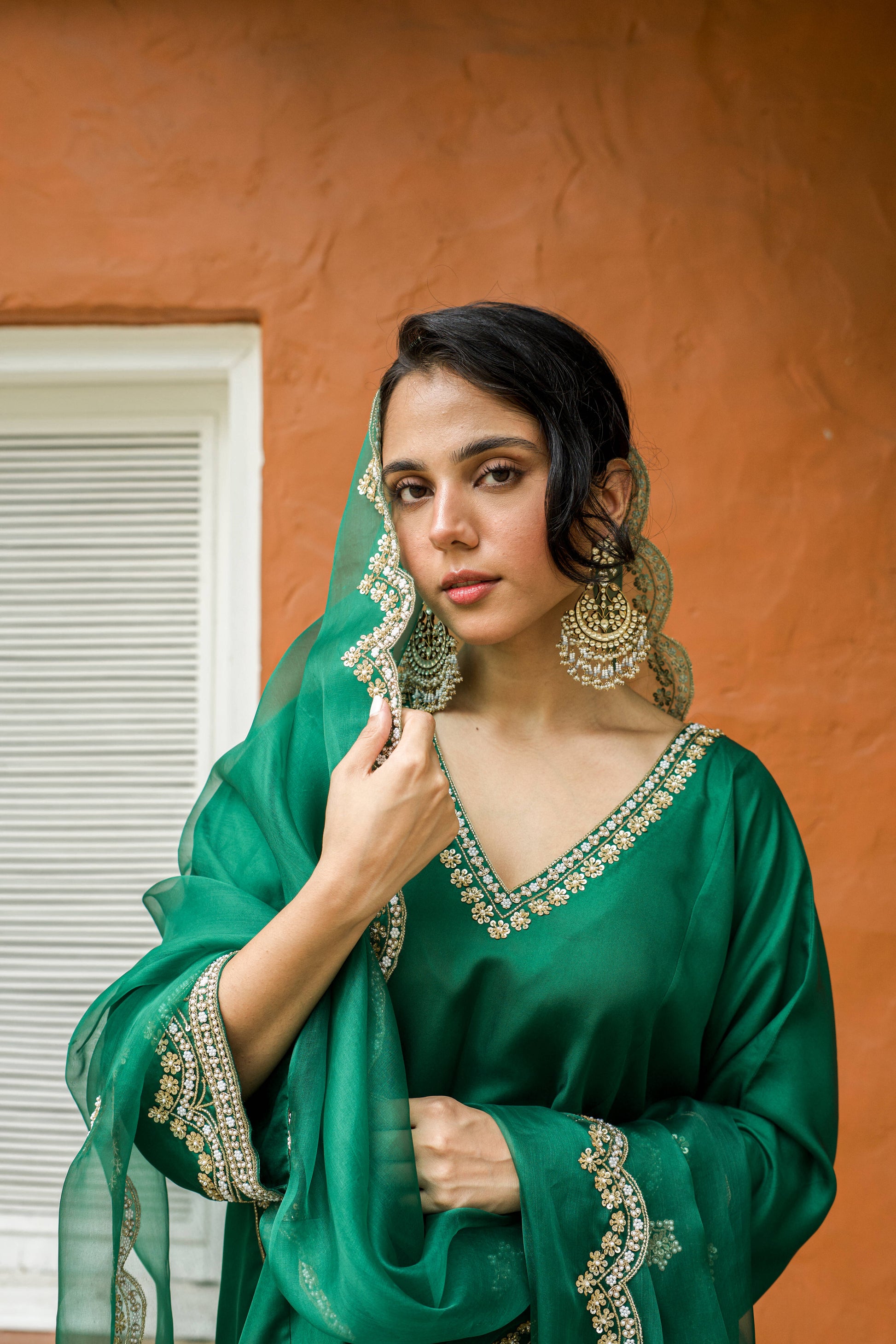 A pure silk suit set with a soft V-neck, relaxed silhouette, and embroidered detailing. Finished with a scalloped organza dupatta and matching potli, it feels elegant, fluid, and quietly festive.