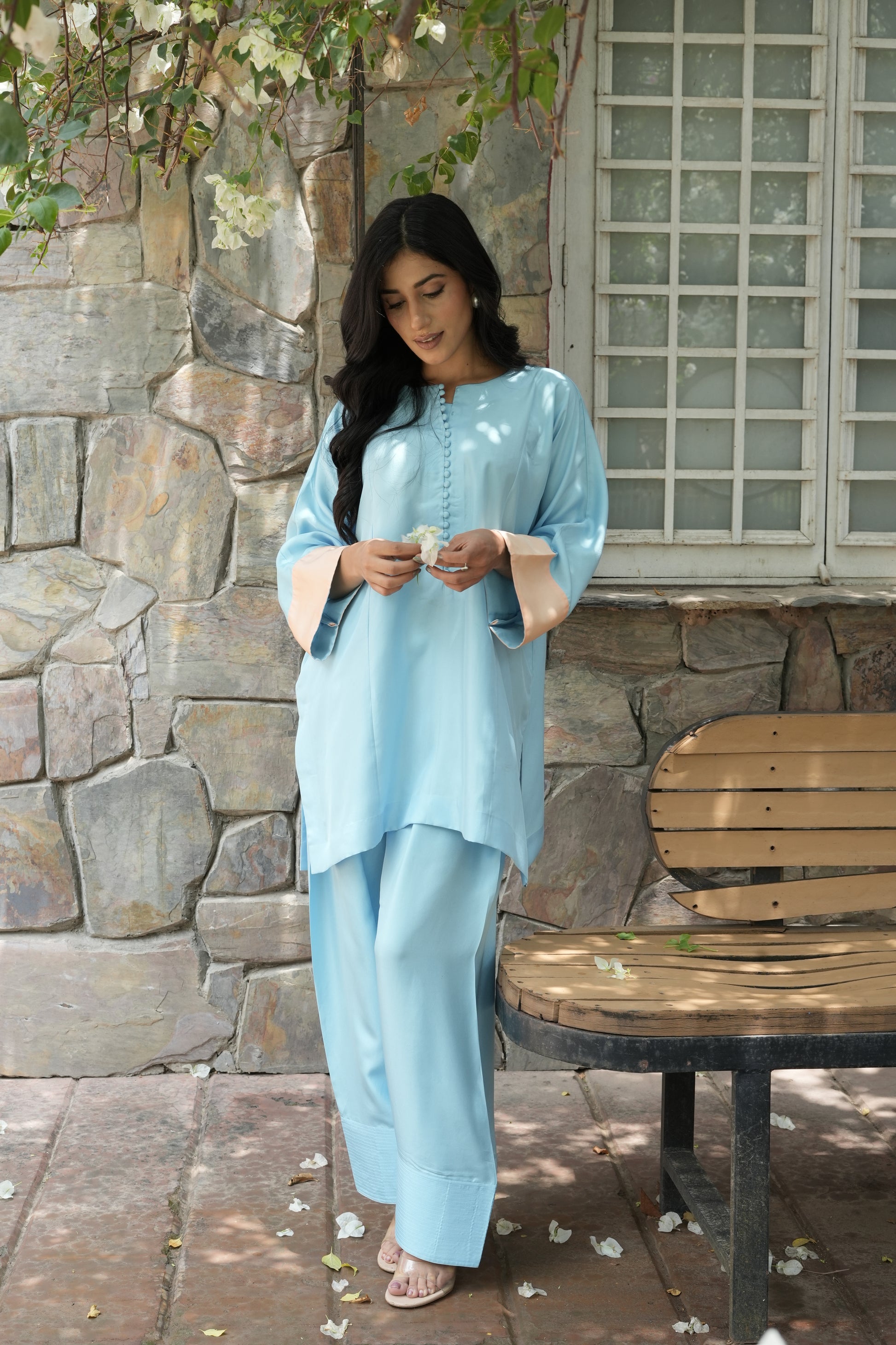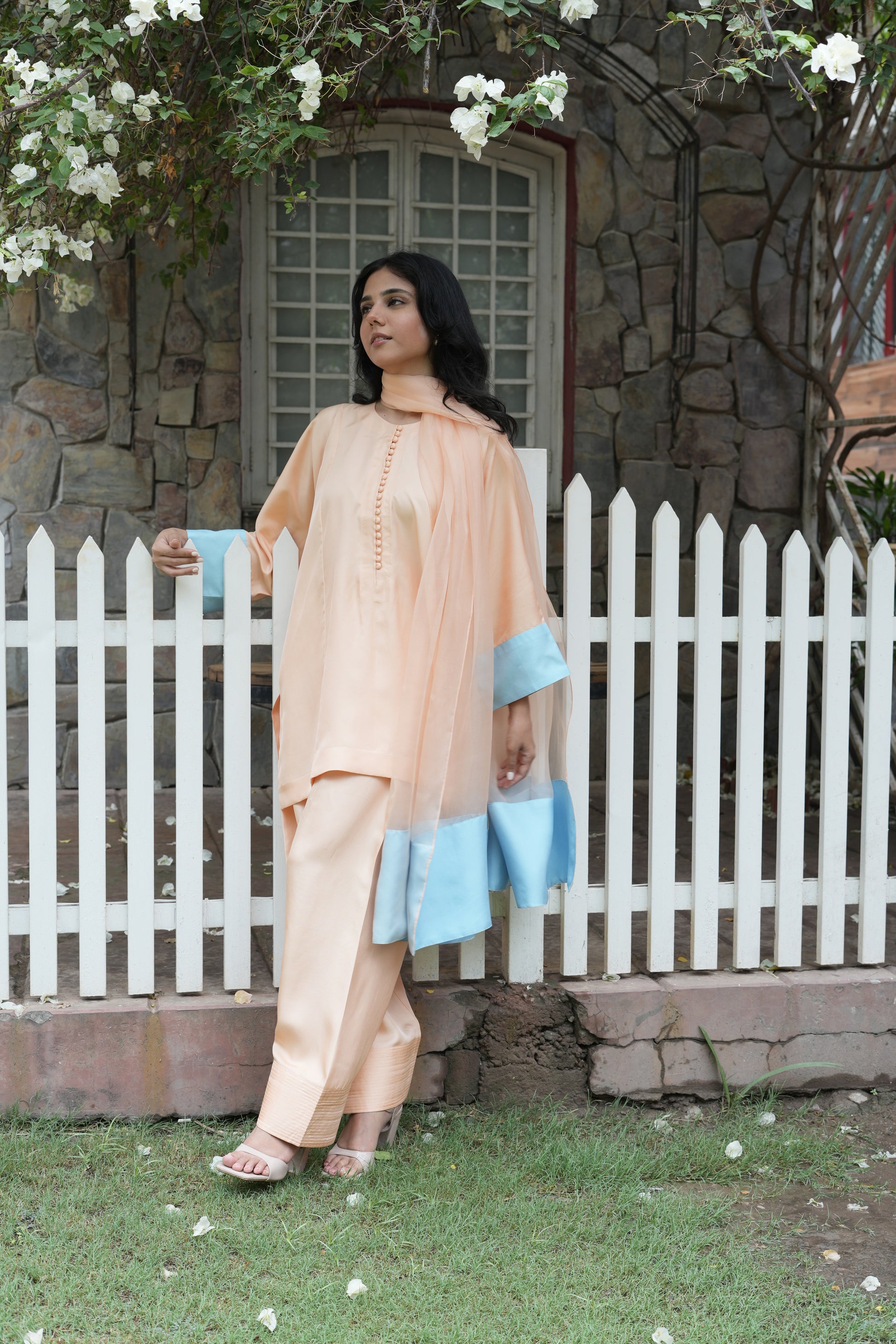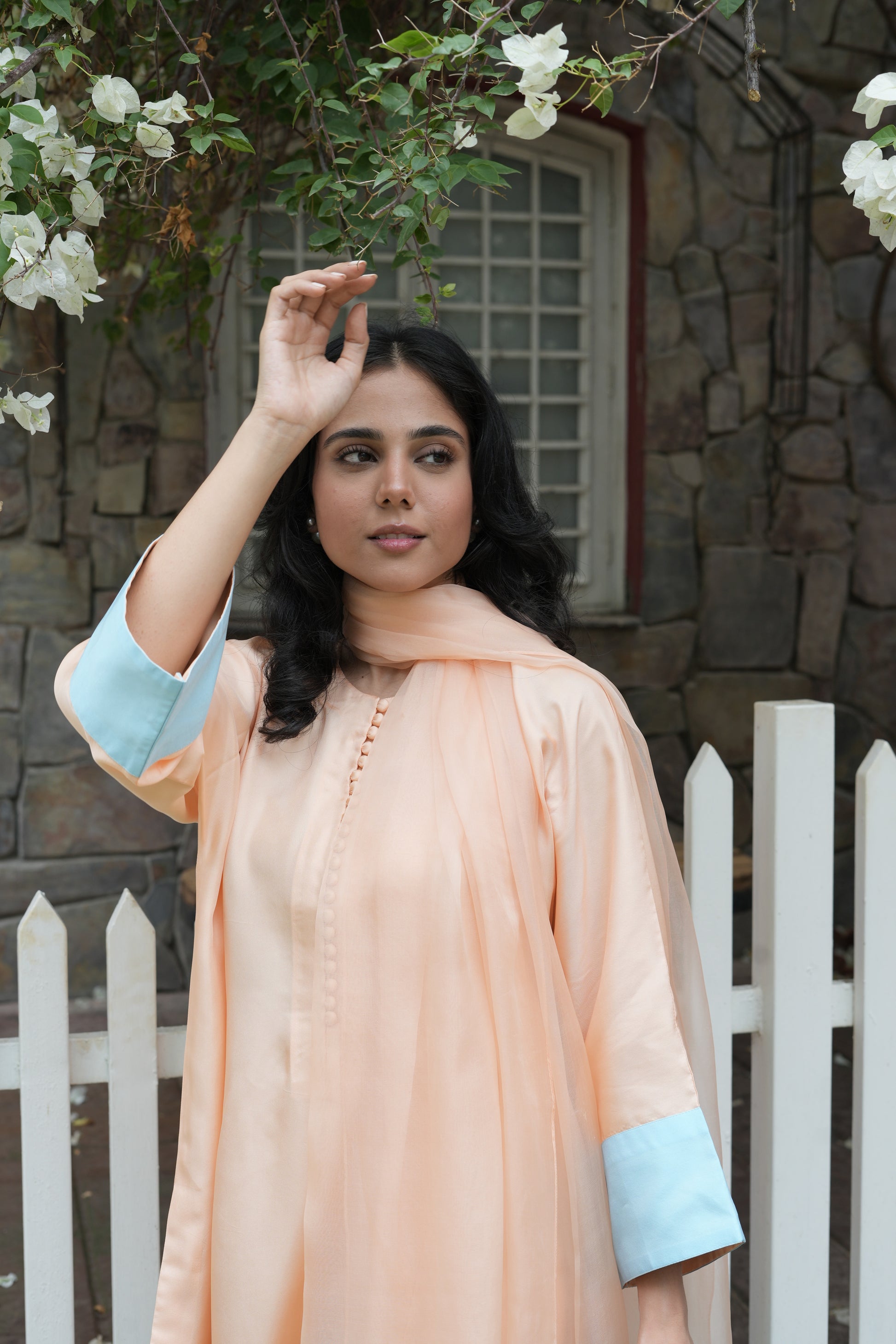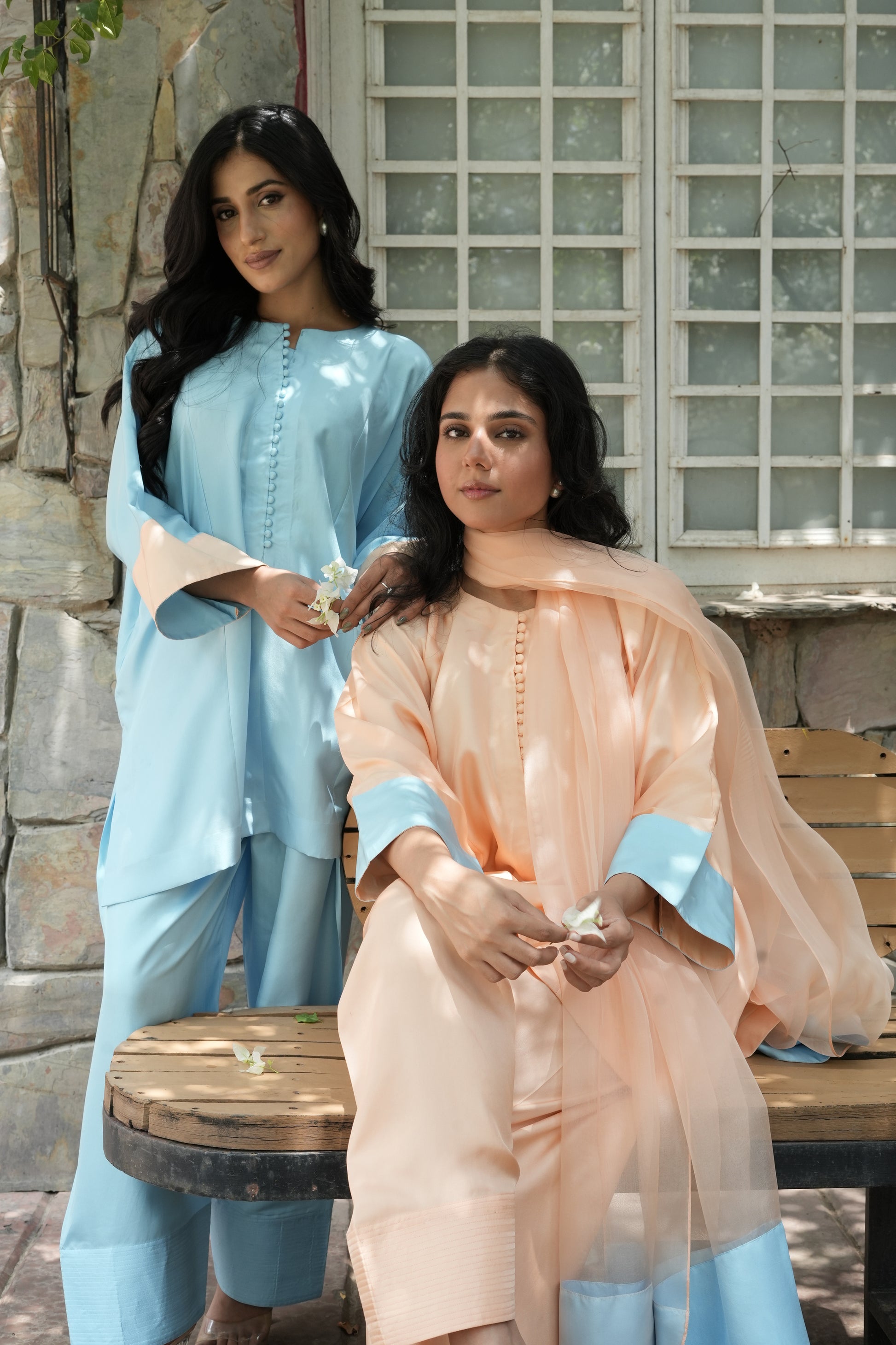 A gentle blend of peach and powder blue in a relaxed silhouette, finished with a farshi salwar and soft georgette dupatta.