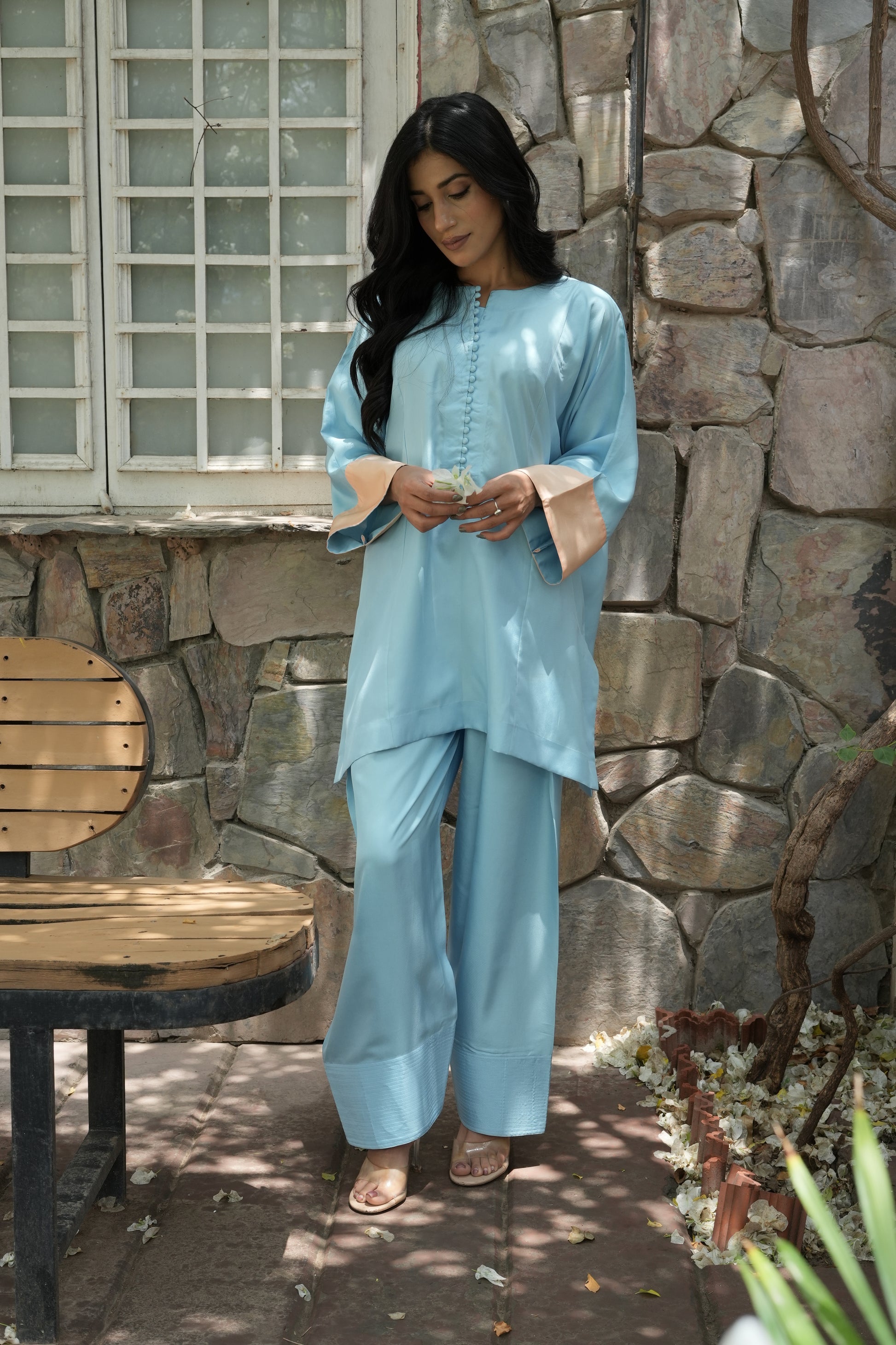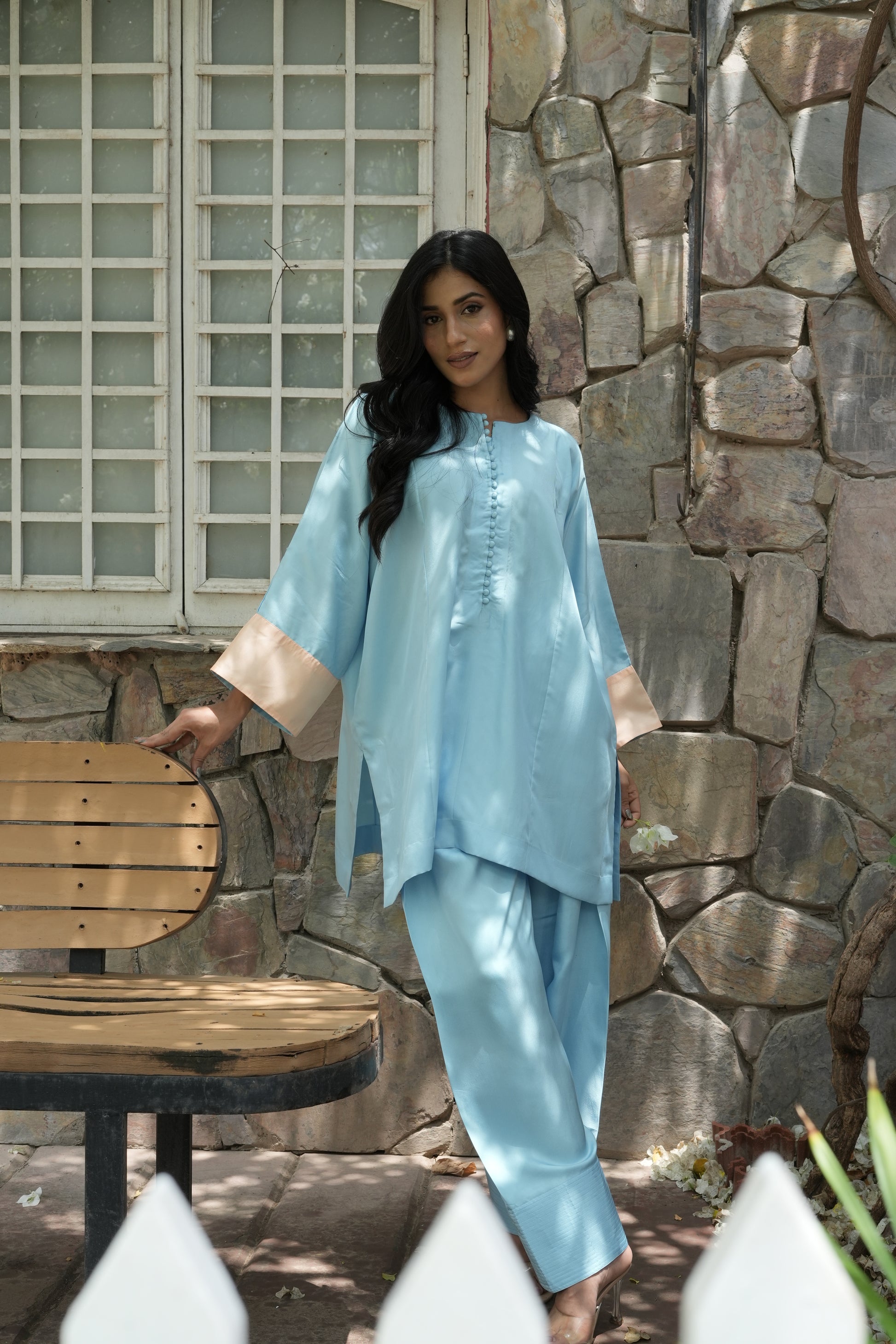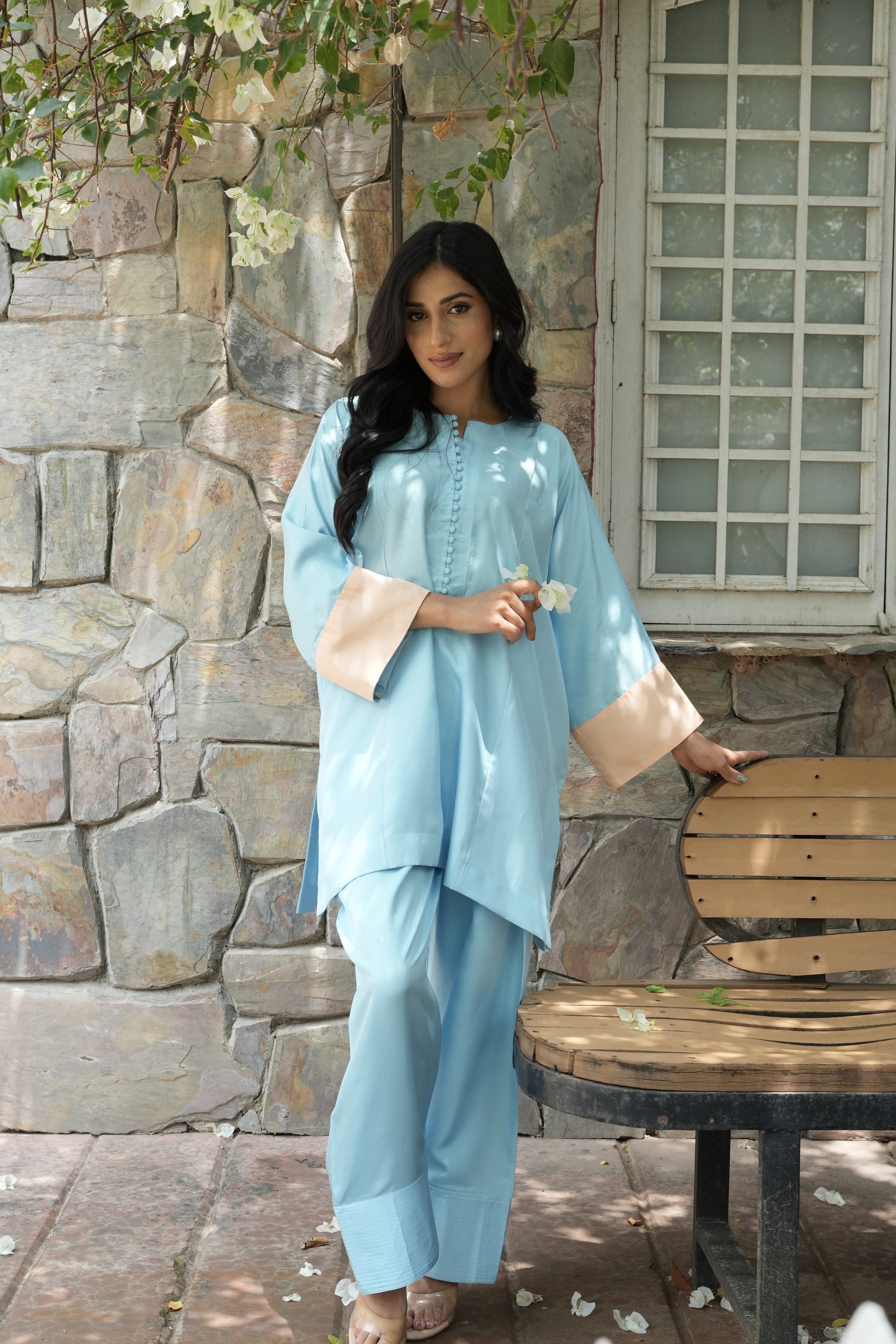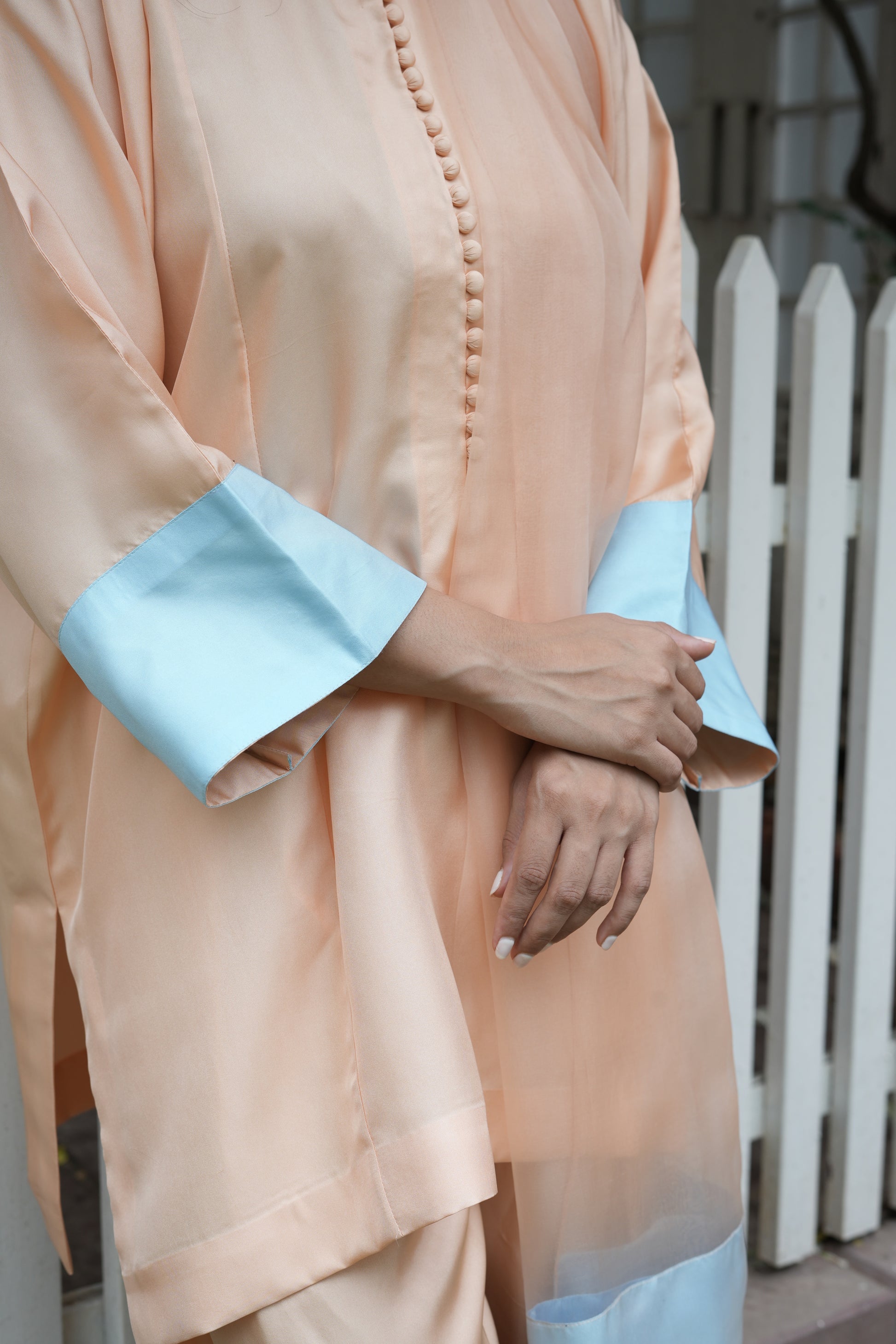 A gentle blend of peach and powder blue in a relaxed silhouette, finished with a farshi salwar and soft georgette dupatta.